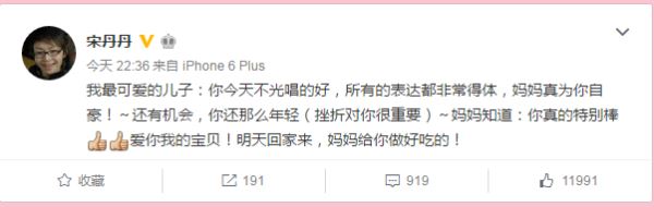 比赛结束后,巴图母亲宋丹丹也发微博声援儿子,夸赞儿子表现优秀,赶快回来吃饭。