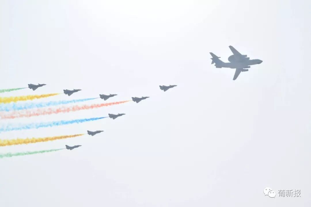 空中梯队从远方呼啸而来,依次低空飞过。教练机梯队划出7条彩带,向共和国献上生日祝福。