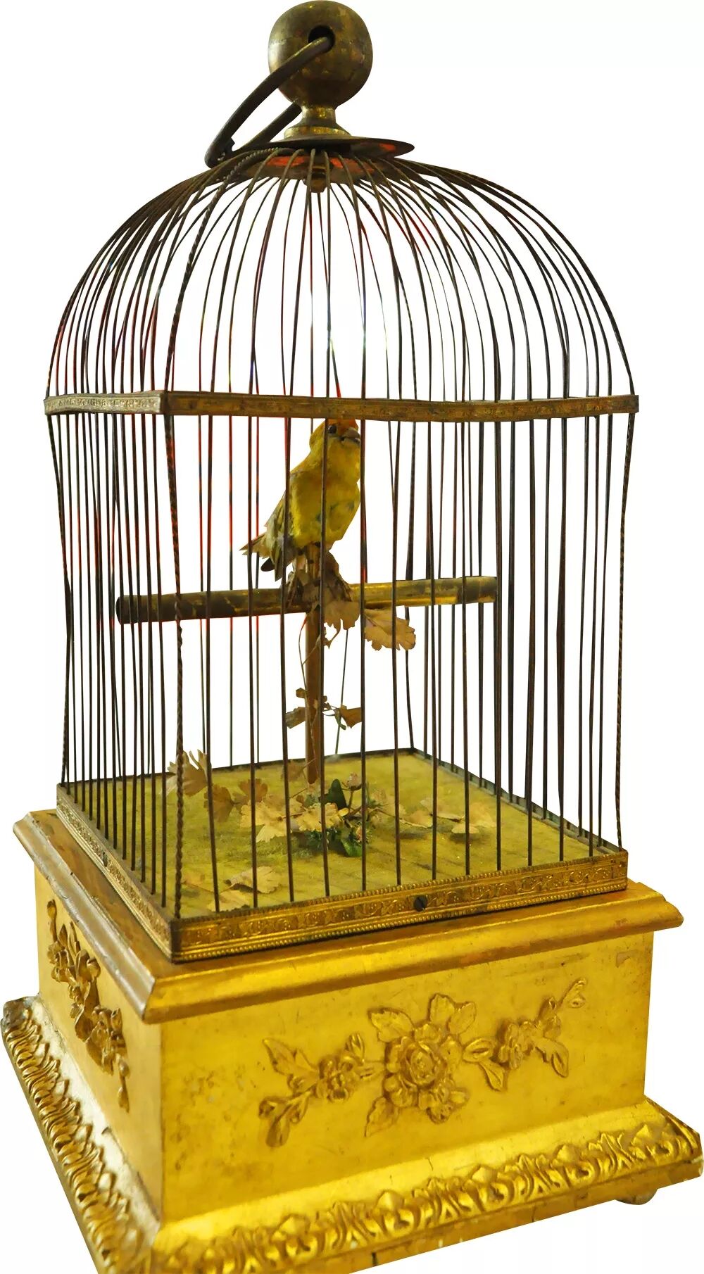19世纪中叶,来自法国Bontemps的唱歌鸟笼音乐盒。 笼子的下半部分由木头制成,而且镀了金。