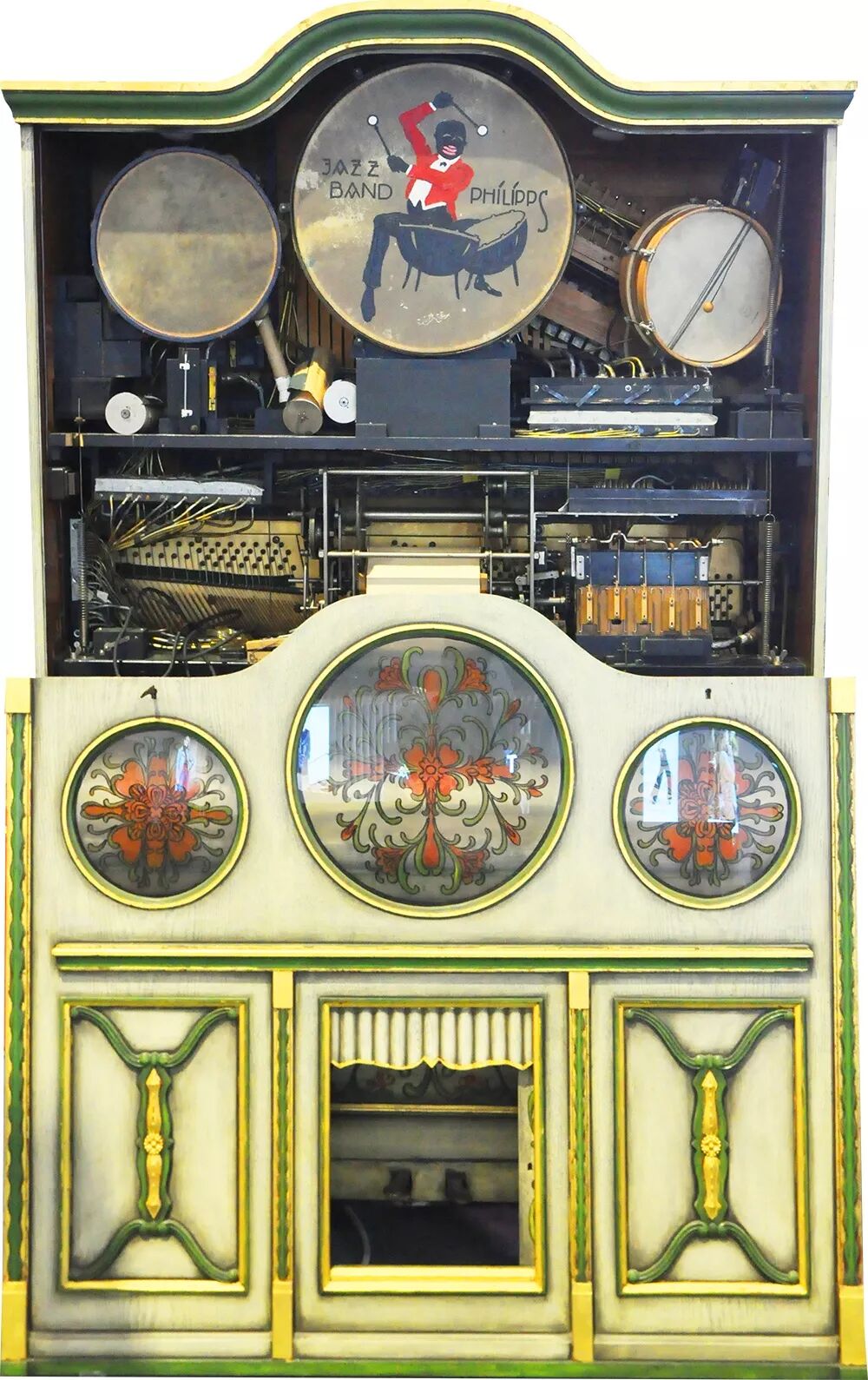 菲利普斯产的组合乐器自1927年起被称为'爵士乐队'。表壳由橡木制成,并配有彩色玻璃。有几处的木材也上了色。它有七种乐器:大鼓,小鼓,铃鼓,钢琴,曼陀林 ,管乐和木琴,可以调节速度和音量,在这个世界上只剩下几个这样大小的组合乐器。组合乐器可以代替整个管弦乐队,通常在餐馆或酒吧中演奏取乐。 但是,它们很昂贵,只有富人才能负担得起。