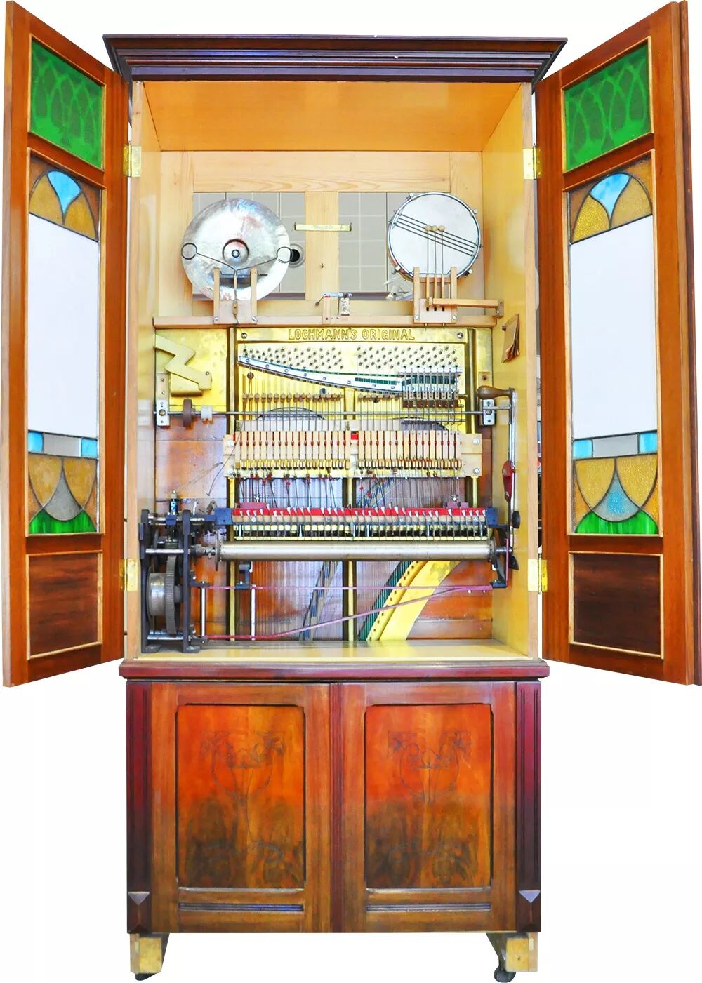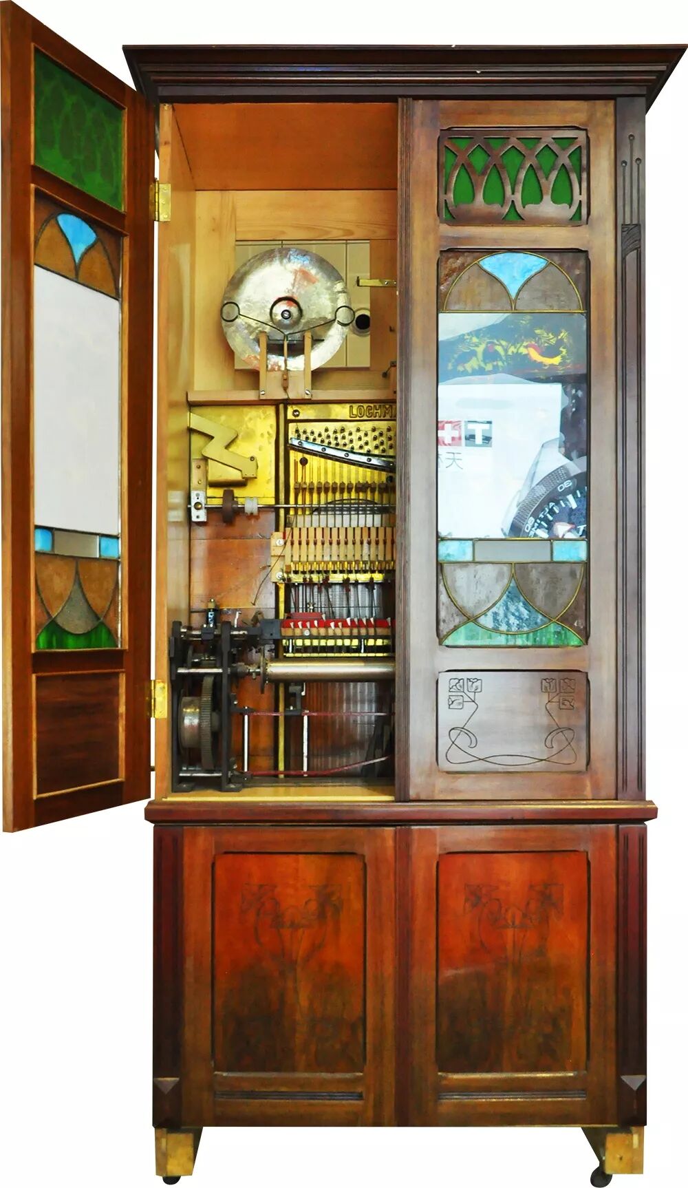 大约产于1900年的原装Lochmann组合乐器。它装在胡桃木柜中。 门上装饰有彩色玻璃,展现了鸟类和瀑布的浪漫风景。 组合乐器装有两个三角铁,一个小鼓,一个钹和一架钢琴。