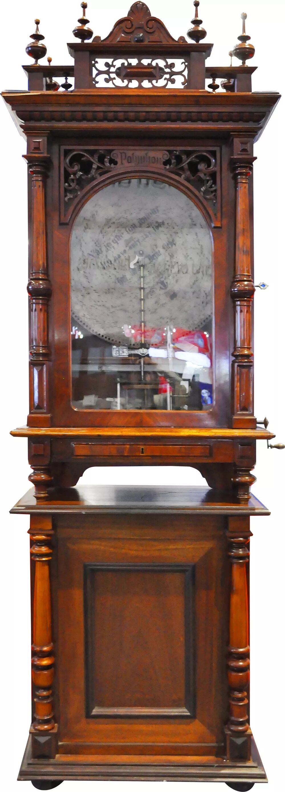 大约产于1880年(德国经济繁荣时期)的原装的Polyphon大碟音乐盒。 它装在一个胡桃木柜中,顶上有一个时钟和一个顶盖,顶盖上有一个栅栏,非常了不起。 钟的表盘由黄铜制成,带有丰富的装饰。 木柜装饰有带拐弯的柱子和精美的雕刻。 它还包括一个用于放置音乐碟片的柜子。音乐盘尺寸为62.5厘米。 它有一个双头齿梳和铃铛,这很特别。 该音乐盒还用于餐馆和咖啡馆的娱乐,因此,它包括一个投币口。这样,客人就可以听一些投入几芬妮就可以听到的旋律。这是一种非常罕见且独特的机械乐器。