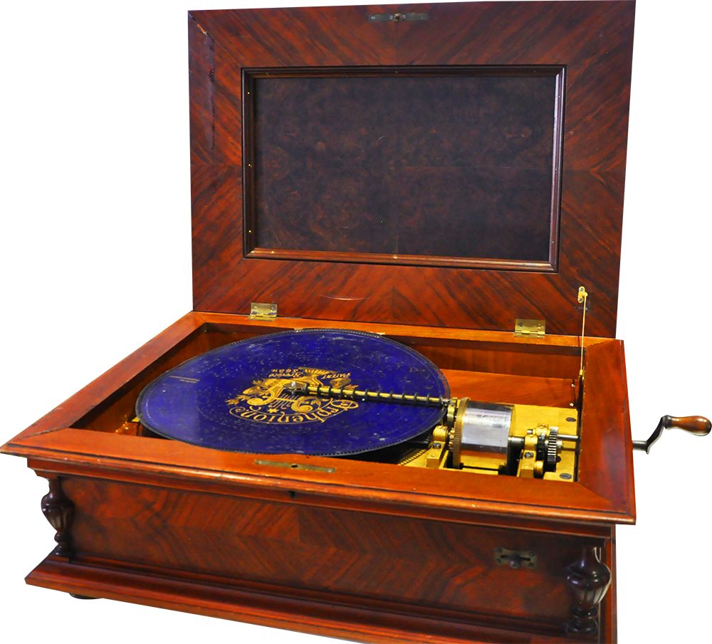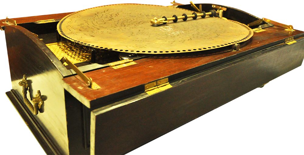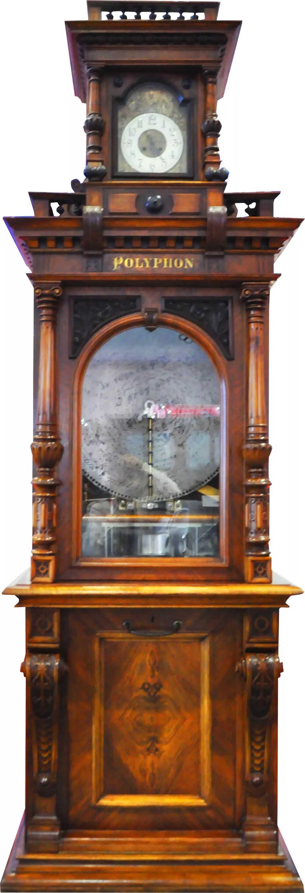 大约产于1880年(德国经济繁荣时期)的原装Polyphon大碟音乐盒。 它装在胡桃木柜中,并有顶冠。 木柜装饰有转弯的柱子。 它还包括一个用于放置音乐碟片的柜子。 音乐板尺寸为62厘米。 该音乐盒还用于餐馆和咖啡馆的娱乐,因此,它包括一个投币口。 这样,客人就可以听一些投入几芬妮就可以听到的旋律。