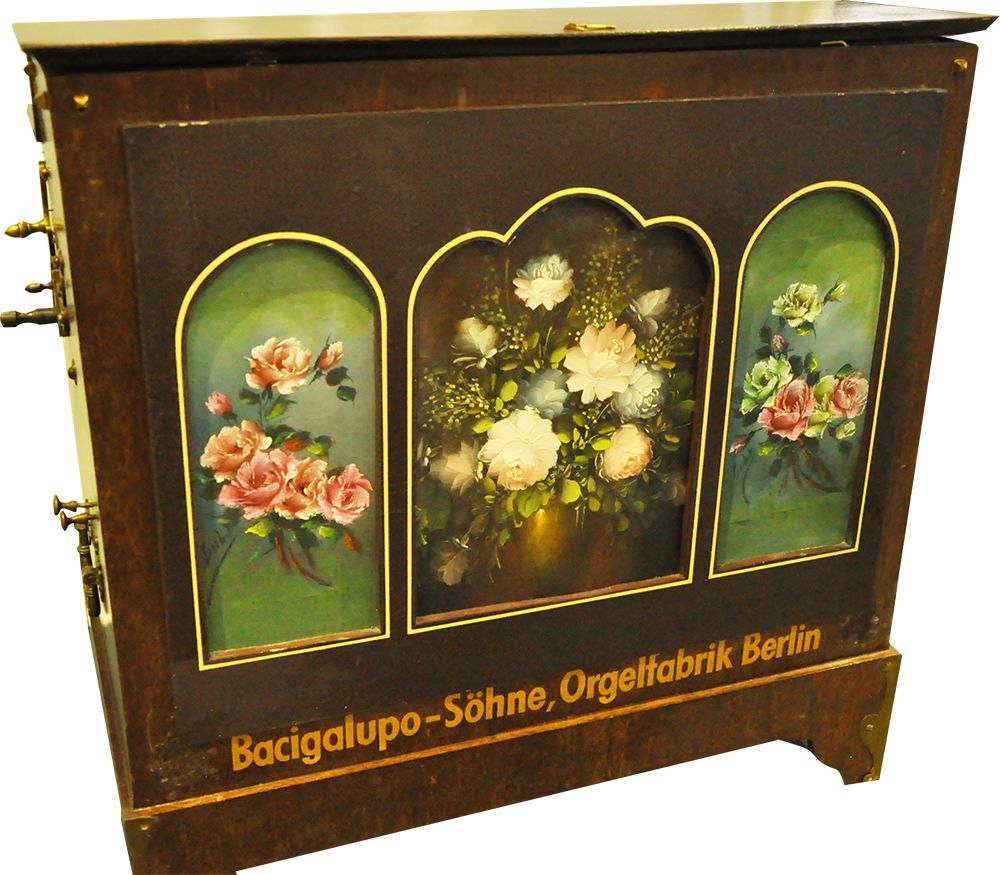 19世纪的C. Bacigalupo制作的管风琴。表壳饰有桃花心木贴面,并镶嵌有精美的饰物。下部边缘饰有黄铜涂层,还可以保护木材免受损坏。正面还饰有不同的奖章。 管风琴可以演奏10个旋律,该管风琴由木管和木质圆筒制成,有2个风琴音栓(寄存器)。