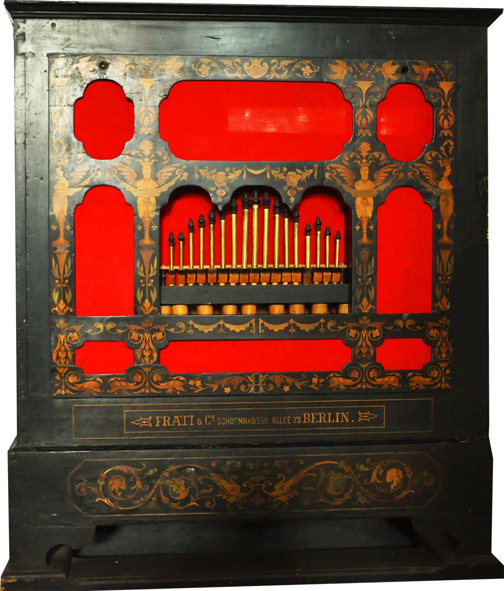 «Frati&Co.SchönhauserAllee 73 Berlin»49键管风琴来自德国。 由Bacigalupo提供1音桶的音乐。 深色表壳的正面有切口,上面覆盖了美丽的红色背景。 外壳装饰了神话形象和花环。 演奏状况良好。
