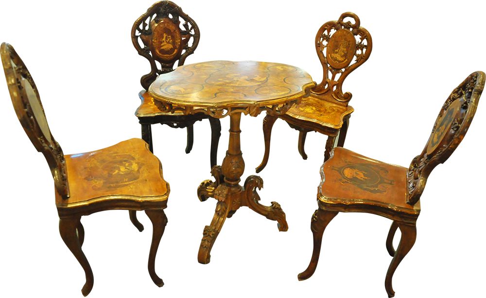 一个完整的餐桌椅套装与19世纪的音乐盒合二为一。 这套桌子椅子包括四把椅子和一张桌子。 它由菩提木制成,并具有非常细致的雕刻和来自不同种类木材的镶嵌物。 其风格表明家具套装产于瑞士。 椅子上有一个内置的圆筒形音乐盒,可以通过施加到椅子上的重量开启它。 桌子有精美雕刻的中腿,弧形的餐桌上装饰有最精致的镶嵌物。 这些家具被贵族家庭用作沙龙的展示对象。