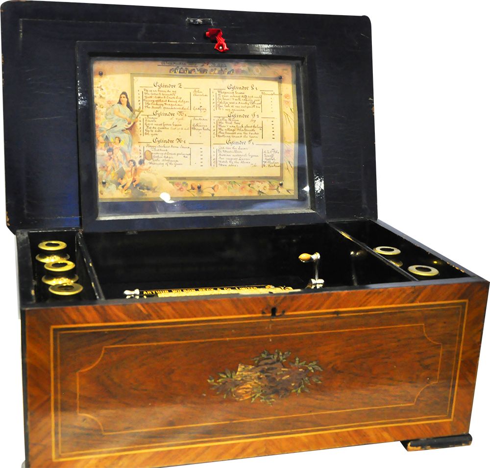 亚历山德拉(Alexandra)圆筒音乐盒,拥有大约1890年前后可替换的圆筒。音乐盒有6个圆筒,每个圆筒有6个旋律,它们显示在后盖上。 总共可以播放36首音乐。