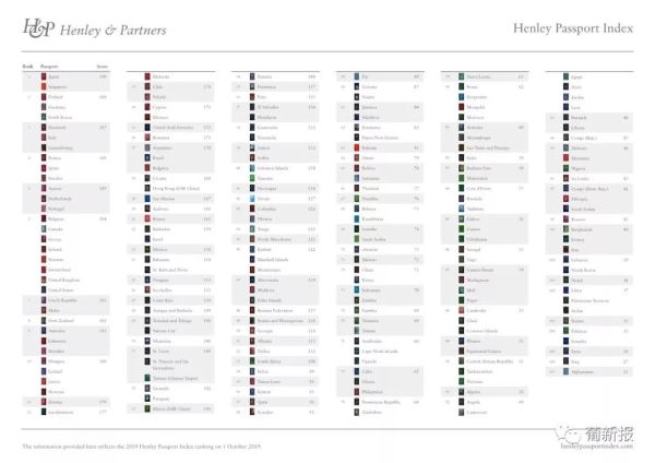 日本、新加坡以免签190国和地区夺冠,第2位的分别是韩国、德国及芬兰,有188个免签国家;丹麦、意大利、卢森堡则是187个免签国排行第3;而美国有184个免签国,排第6名,与上一季持平;香港则以168个免签地排名第18位,较上季上升1位;澳门排名第33位,与上一年持平;至于排名第72的中国,则较上季下跌1位。