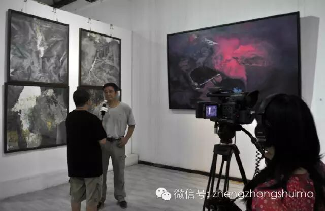 中国著名收藏家赵云峰先生与画家郑忠交谈,了解郑忠的参展水墨作品<谷音系列>